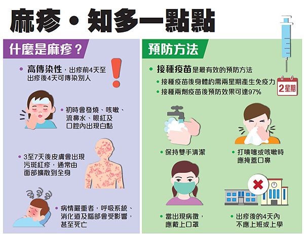 麻疹是一種高傳染性的疾病。病人從出疹前4天至出疹後4天內可把病傳染給別人。
