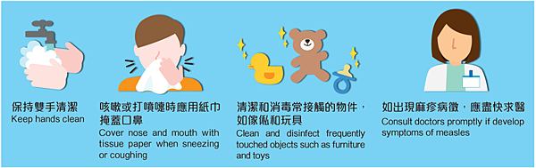 麻疹病人應避免與未有免疫力人士接觸,尤其是抵抗力弱人士、孕婦及未滿一歲的兒童。